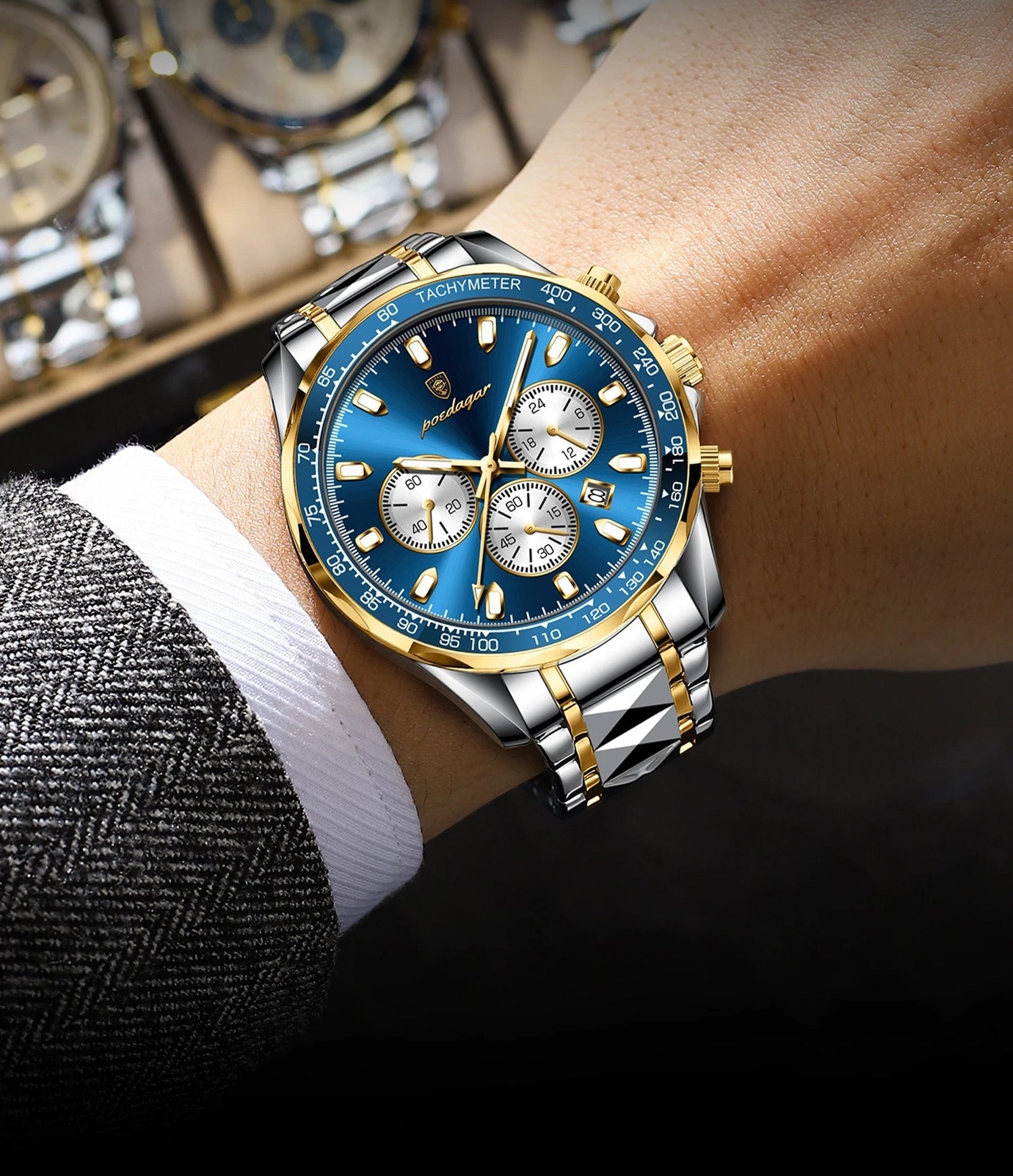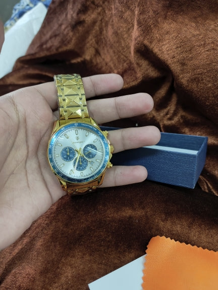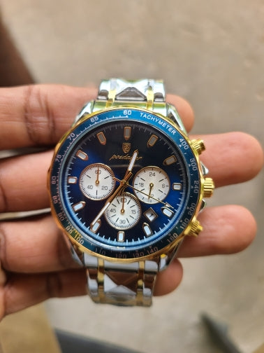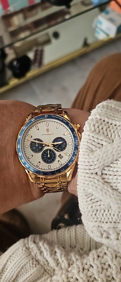 The Quantum Blaze Prestige instantly stands out. The gold and blue accents catch the light in a way that makes this watch impossible to ignore. It feels substantial on the wrist and adds a bold finishing touch to any outfit.