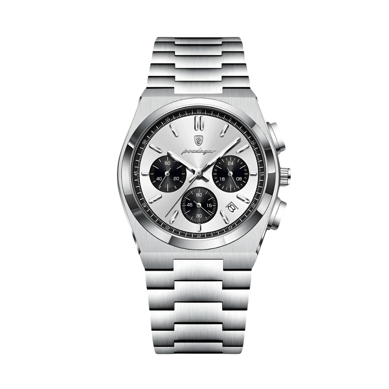 Sleek silver tones meet edgy design elements. Silverthorne balances polished elegance with contemporary character, creating a versatile timepiece that transitions effortlessly from business to leisure with distinctive metallic brilliance.